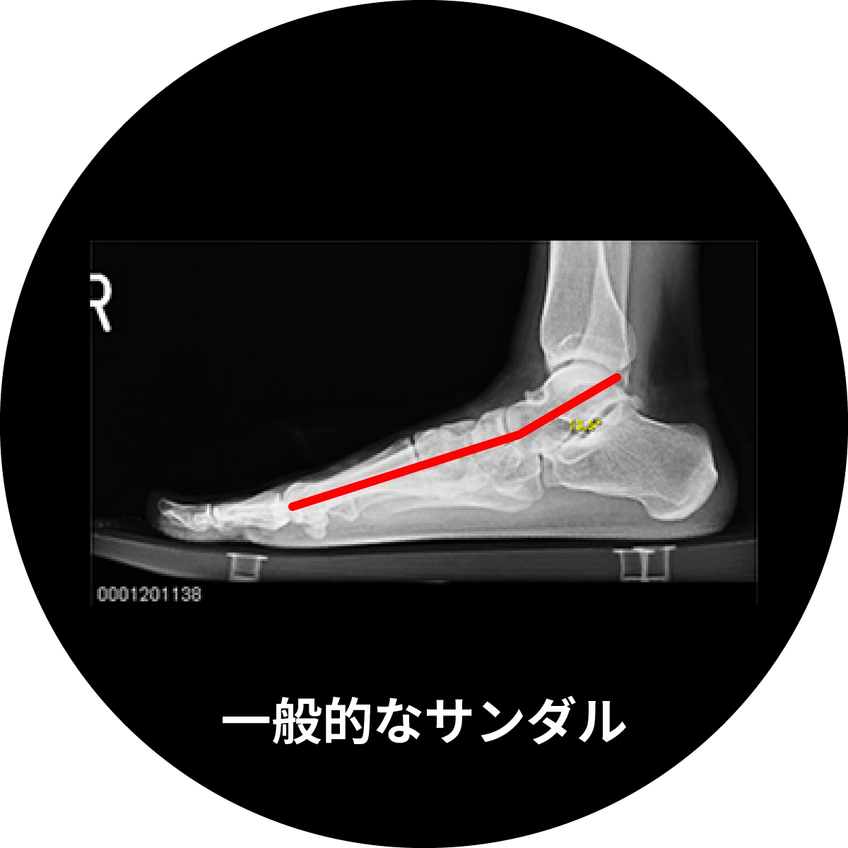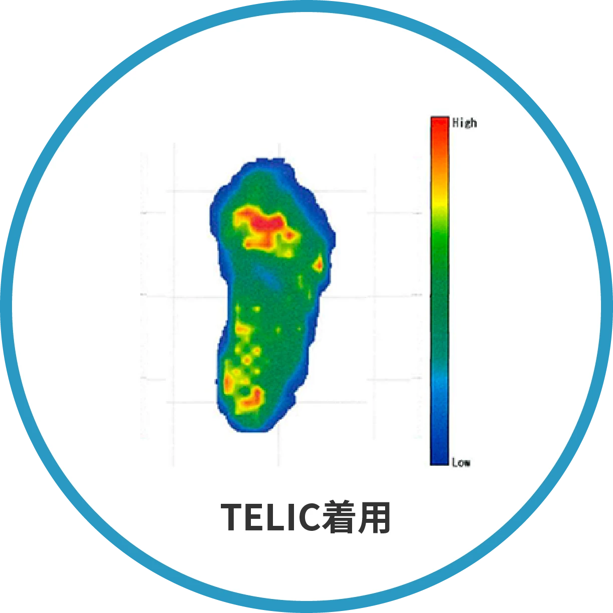 足裏にかかる圧力を、一般のサンダルと比較したところ、TELICは圧力が分散しています。特定の箇所に圧力が集中すると、痛みなどが症状として表れますが、TELICは足裏への負担だけでなく、骨や関節、筋肉や腱、足の裏の皮膚といった足全体の負担も軽減します。